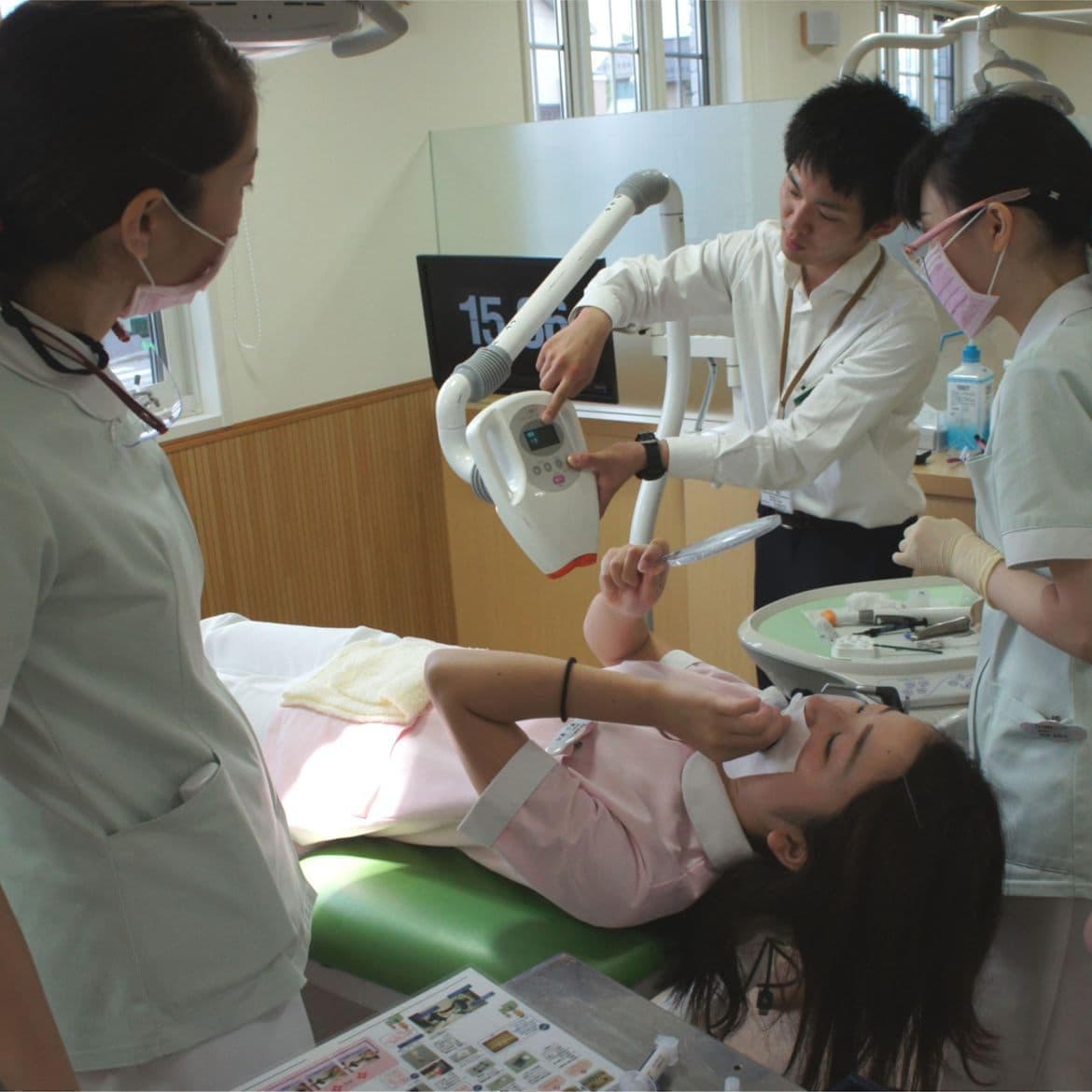 新人スタッフが皆様に御迷惑をおかけしないように、しっかりと時間をかけて日々の診療トレーニングを行っています。また、歯科衛生士学校の実習生受け入れ医院の指定を受け、将来の歯科衛生士育成への貢献もしています。